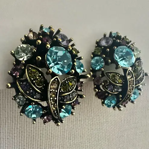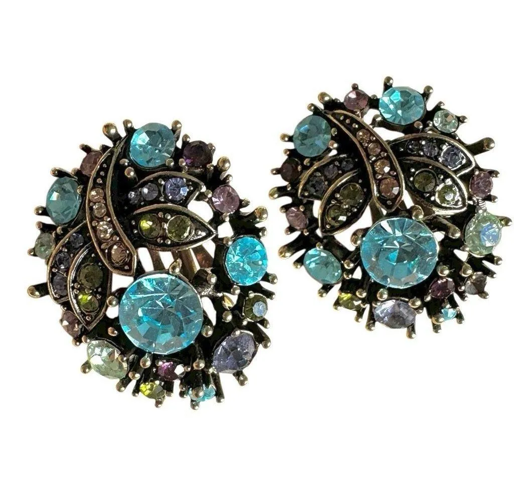 Gorgeous Heidi Daus statement clip-ons set in antiqued gold tone with sparkling crystals in aqua, pe... Show more
