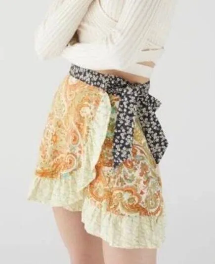 Urban Outfitters Toni skirt Wrap style Attached tie waist belt Ruffle edge Paisley floral print Fabr... Show more