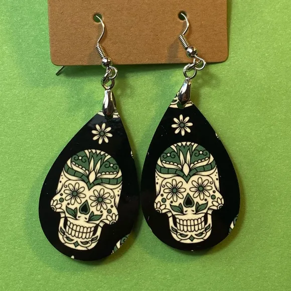 Sugar Skull, Green, Floral, Dangle Pierced Earrings New - $9 New With Tags - From Shari