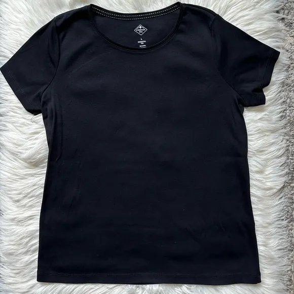 St. John’s Bay black cotton essential T-shirt with crew neck, short sleeves. Ladies’ size large. Exc... Show more
