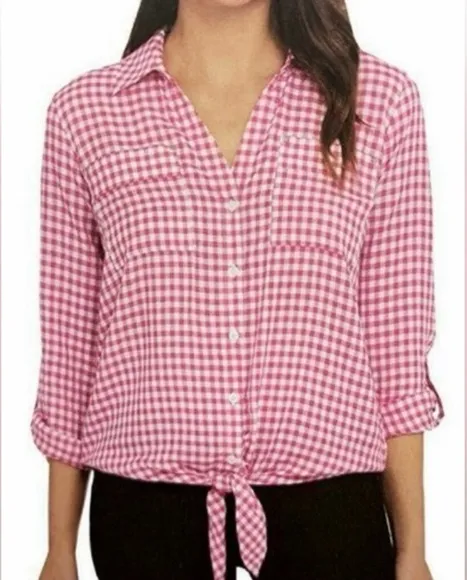 JONES NEW YORK tie front button up long roll up tab sleeve with button cuffs, gingham checkered whit... Show more