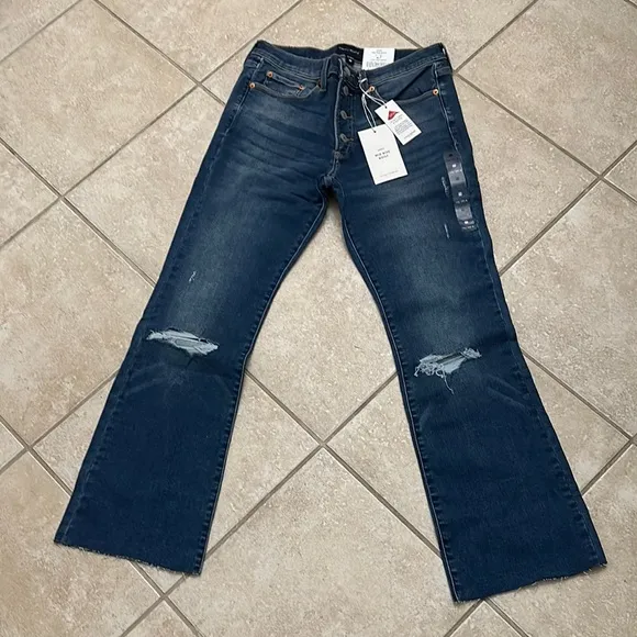 Stylish dark wash jeans with distressed details. Mid-rise boot design. Perfect for casual wear. SIZE... Show more