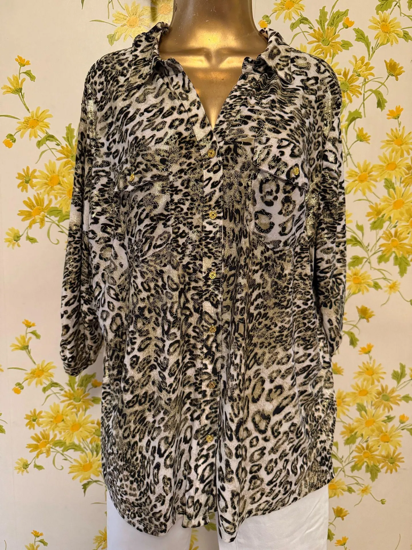 Emily Daniels Metallic Leopard Print Button Up Shirt metallic Gold, roll up sleeves, button up front... Show more