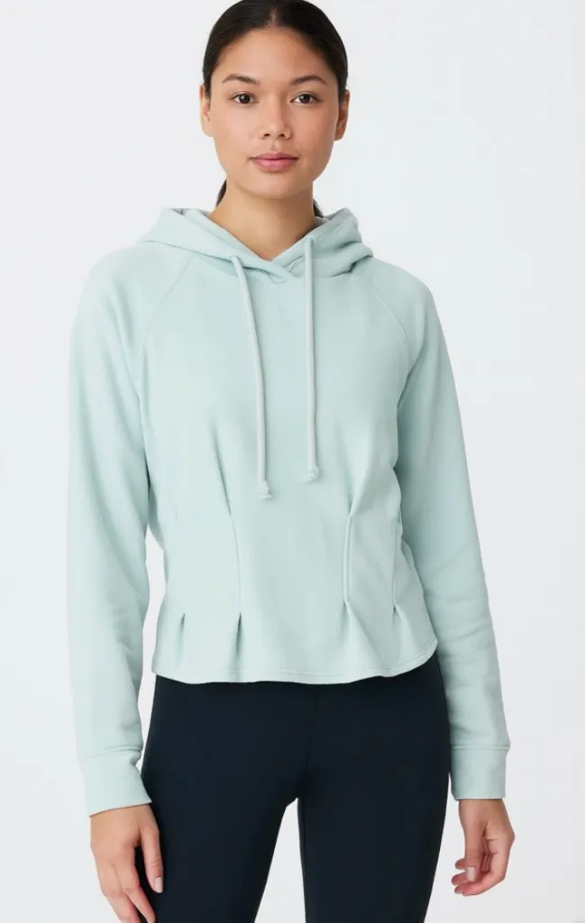 athleisure, studio-to-street, soft hoodie, cropped sweatshirt, pleated front, lightweight layer, casual sporty, loungewear chic, active casual, weekend wear, Fabletics hoodie, cropped sweatshirt, light blue hoodie, drawstring hood, pleated sweatshirt, athleisure top, women’s activewear, sporty layer, raglan sleeve hoodie, medium size, workout layer, casual blue hoodie