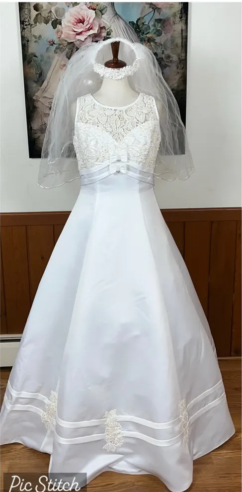 This beautiful white satin wedding dress features intricate lace details and a charming bow accent. Train is detachable! Includes veil! Gown was preserved so it’s in excellent condition and ready to wear! Bust measures 38”, waist is 32”, length is 60”