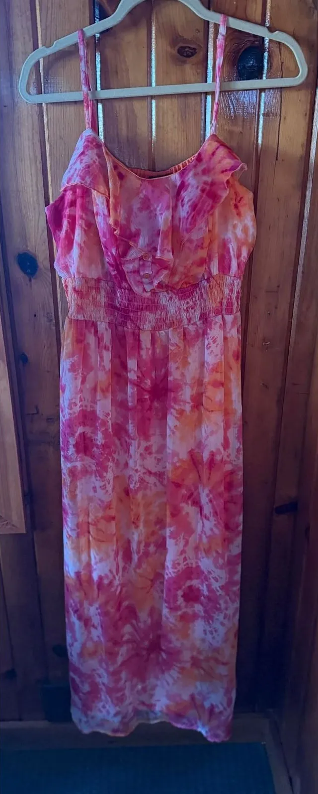 Flowy maxi dress featuring a vibrant tie-dye pattern in shades of pink and orange. This sleeveless d... Show more