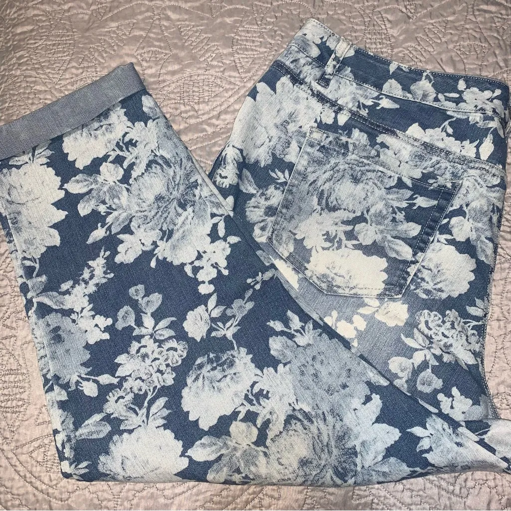 Cute flower print like cyanotype sun printing. Cute for spring and summer. Inseam = 25 inches Ri... Show more