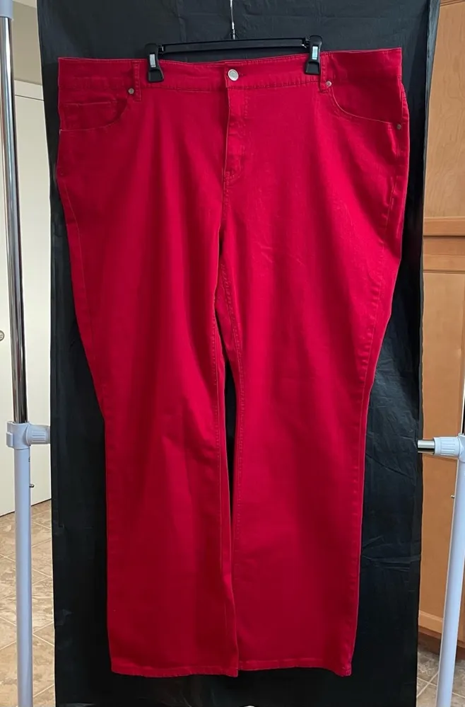 Bright red flared jeans. Comfortable and stylish. Perfect for a standout look. Excellent preowned co... Show more