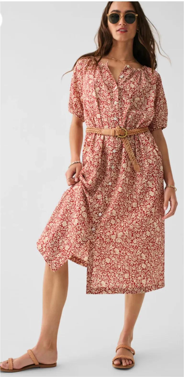 $228 Faherty Carmel Midi Dress Size XS Spice Sunrise Floral Orange Shirtdress Boho Excellent condition When spring is in the air, our thoughts turn to wearing pretty, flowy dresses again. The Carmel Dress epitomizes casual elegance with a shirred neckline creating loose, comfortable gathers that can be shaped for a more fitted look with a self-tie belt. Mussel shell buttons shirring around the neckline self-belt Material: 100% Organic Cotton, Real Agoya Shell Buttons #11f534 All measurements are taken laying flat and approximate: Bust: 22” Waist: 19” Length: 45” Tags: boho, bohemian, hippie, hipster, festival, beach, summer, spring, tunic, oversized, western, trendy, cute, chic, minimalist, textured, quiet luxury