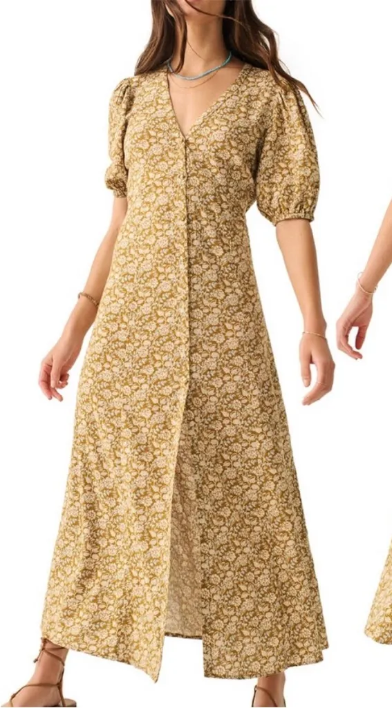 Faherty Havana Golden Theodora Floral Button Down Puffed Sleeves Maxi Dress Size Medium Color Golden Yellow with White and Light Blue details Fabric Linen and Viscose Empire bodice with flowy skirt Elbow length Puffed sleeves Covered buttons down front of dress V neckline Princess seams at skirt Gorgeous floral pattern No holes or stains Like new condition 0108