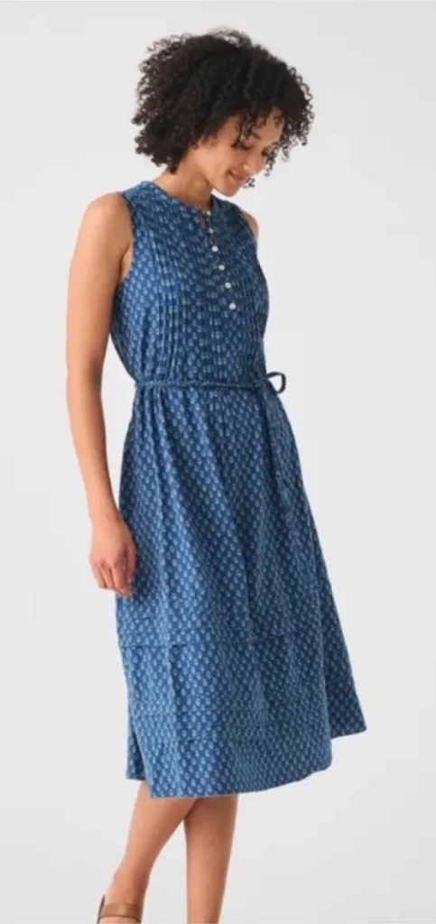 Delicate pintucks keep it slim through the bodice, while the airy and lightweight fabric drapes with a graceful flair. Tie the braided fabric belt for easy definition at the waist. Hidden Side Entry Pockets. Single layer pleats at skirt with picot edge finish. Fit: Relaxed fit Length: 47" Material: 55% Linen, 45% Ecovero; Agoya Shell Buttons Good pre-owned condition