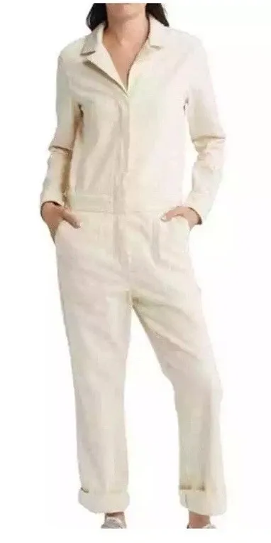 The Faherty Jumpsuit in size Large is a stylish and sustainable choice for the fashion-conscious woman. This cream-colored one-piece jumpsuit is made from organic cotton twill, making it not only comfortable but also eco-friendly. Featuring long sleeves, a relaxed fit, and a convenient zip closure, this jumpsuit is perfect for everyday wear or special occasions. Ships next morning