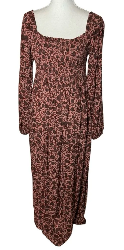 Great preowned condition Feminine and flowy, this effortless dress is defined by a stretchy and comfortable smocked bodice and wear anywhere floral print. It can be worn on or off the shoulder while the smocked cuffs at the sleeve enhance its breezy style. Fit: Full length and can be worn on or off the shoulder Detail: Smocked bodice, Square neck, Long sleeve with smocked cuffs Material: 100% Viscose Care: Turn inside out. Machine wash cold with like colors on delicate cycle. Do not bleach. Lay flat to dry. Cool iron when needed. Size XS Measurements are approximate and taken flat Length 49” Chest 13” Sleeve (from top of shoulder) 23”