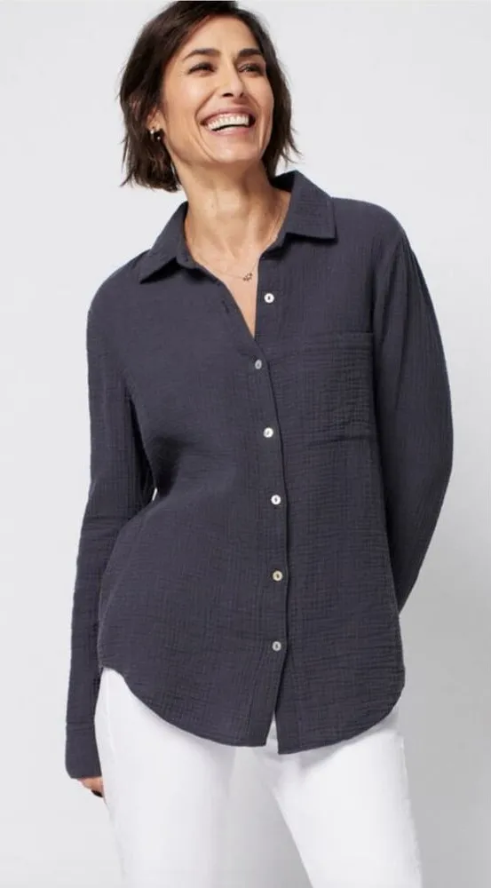 Faherty Women's Dream Cotton Gauze Elise Organic Cotton Blouse Color: Washed Black Size: M Made in China Extra button attached 100% Organic Cotton Excellent used condition, no stains or flaws. Real Agoya Shell buttons Relaxed fit Center Back Box Pleat Measurements: Pit to pit-20" Length-27.25"