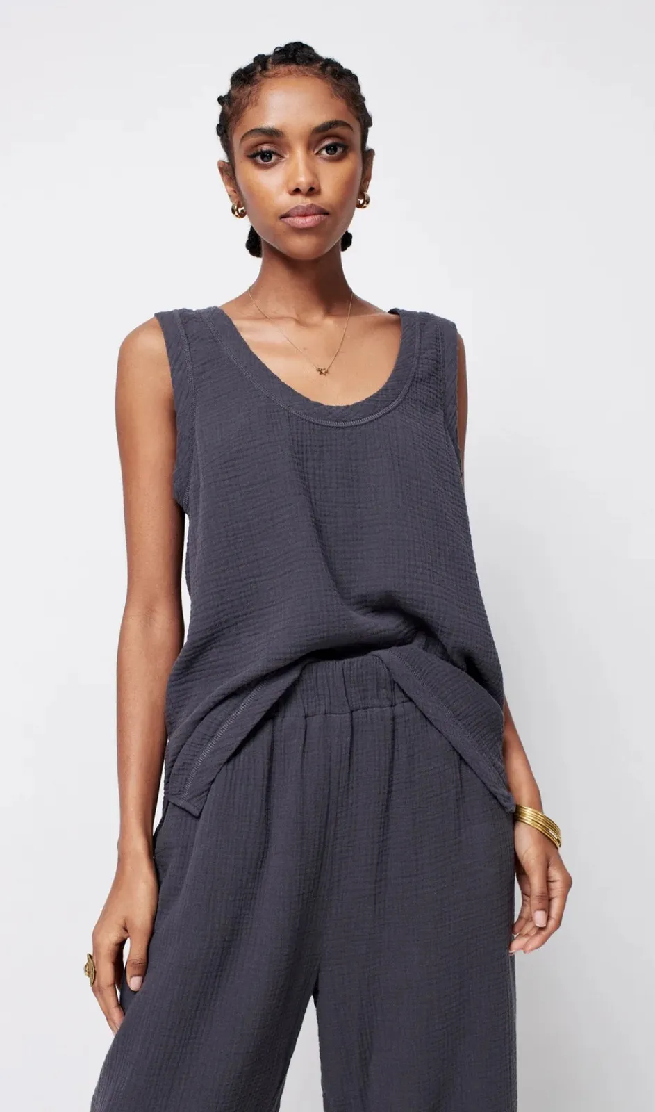 Embrace effortless style with this airy Faherty tunic, a whisper-soft embrace of organic cotton that drapes beautifully. The textured gauze fabric offers a unique tactile experience, while the flattering V-neck and gently gathered smocking at the neckline add subtle feminine charm. Its flowy silhouette and curved hem create a flattering A-line shape, perfect for creating a relaxed yet polished look. This versatile top is ideal for a casual weekend brunch, a breezy beach day, or a comfortable yet chic travel outfit. Type: Tank Department: Women Style: Tunic Material: Cotton, Organic Cotton Neckline: V-Neck Sleeve Length: Sleeveless Sleeve Type: Sleeveless Pattern: Solid Accents: Pleated Theme: Bohemian, Beach, Casual Features: Breathable, Lightweight, Slit Fit: Relaxed Good condition - item has signs of wear, small stain on shoulder Keywords: Faherty tunic, women's gray top, gauze sleeveless shirt, organic cotton tunic, V-neck smocked top, A-line tunic, curved hem top, casual women's clothing, boho tunic, lightweight summer top, travel clothing, comfortable women's wear, breathable fabric