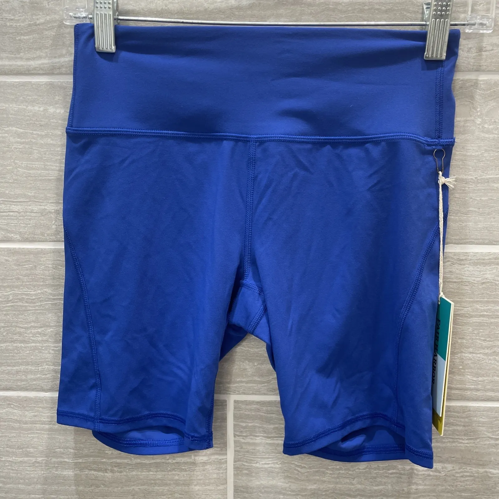 The Fair Harbor Bayview bike shorts in cobalt are designed for women in size XS, featuring a convenient back zipper pocket for storage. Made from a comfortable blend of nylon and spandex, these athletic shorts have a pull-on closure and a 7-inch inseam, perfect for cycling activities. Machine washable and with a stylish design, these shorts are ideal for active women looking for high-performance cycling apparel. They are new with tags. If you have any questions, please ask.