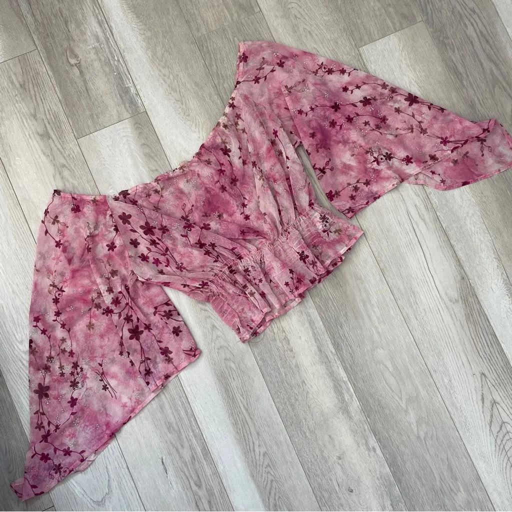 Fairy Floral Mesh Crop Top in the color Pink. Off the shoulder neckline, 3/4 dramatic flowy bell sleeves, smocked waist, crop length. Lightweight, semi-sheer mesh fabric. Floral print with sparkly glitter details. No brand, size, or materials tag but best fits size large-xlarge, womens. Please check measurements to ensure fit. In great pre-worn condition, no major issues. Super cute festival, fairy, bohemian, boho chic, feminine, girly, party, spring summer style. //4.0T