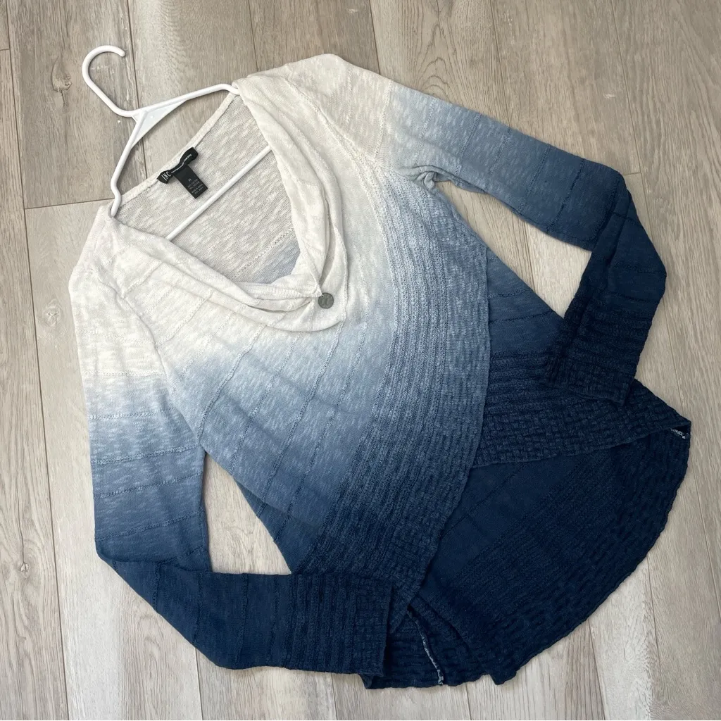 Fairy Grunge Cowl Ombre Top in the color Cream and Blue. Cowl neckline with charm, long sleeve, asymmetric hem top. Ombre design. Lightweight, textured knit fabric. Size medium, womens. In great pre-worn condition, no major issues. 90% cotton, 10% viscose. Super cute fairy grunge, artsy, art to wear, contemporary, vintage, retro, coastal, boho style. Brand is INC International Concepts. //D298, 7.4