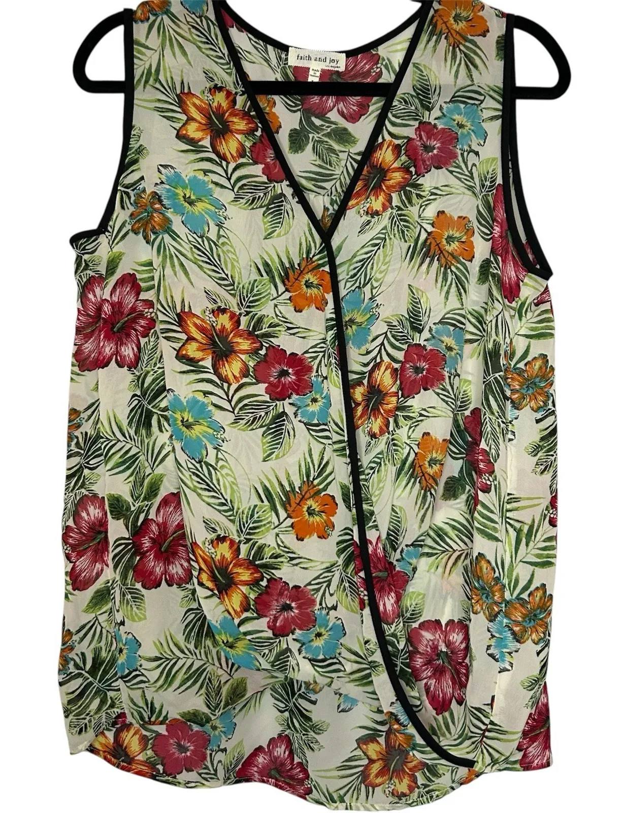 The Faith and Joy Woman's Large Sleeveless Blouse is a vibrant and stylish addition to any wardrobe. Made of polyester chiffon, this floral tropical blouse features a V-neckline and a relaxed fit for comfort and ease of movement. The pleated accents add a touch of elegance, while the pullover closure makes it easy to wear for casual occasions or travel during the summer, fall, or spring seasons. Hand wash only to maintain the beauty of this multicolor blouse from Faith and Joy. Pit to pit 21" Length front 21" back 27" Bin N
