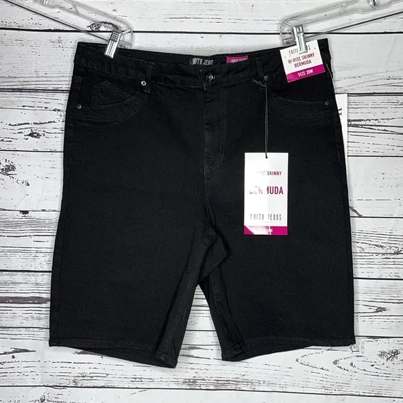 Faith Jeans Woman Size 20W Black Denim Hi-Rise Skinny Bermuda Jean Shorts. Belt Loops. Button with Zipper Closure. 3 Pockets. Cotton, Polyester, Rayon & Spandex Blend. NWT, Brand New with Tags. Length is 22”, Inseam is 10” & Waist 18.5 20”. Measurements taken while garment is laying flat.