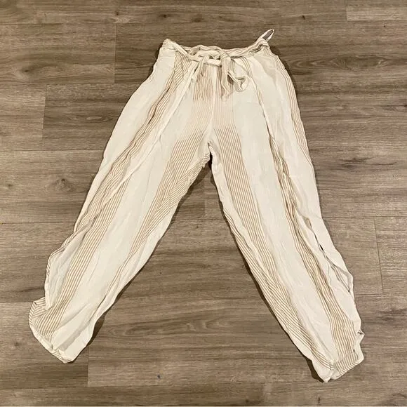Excellent used condition, cover photo to show slit - Length is closer to a capri (refer to measurements) - Open side hems - Vertical stripes - Tie and elastic waistband - Cream and tan color