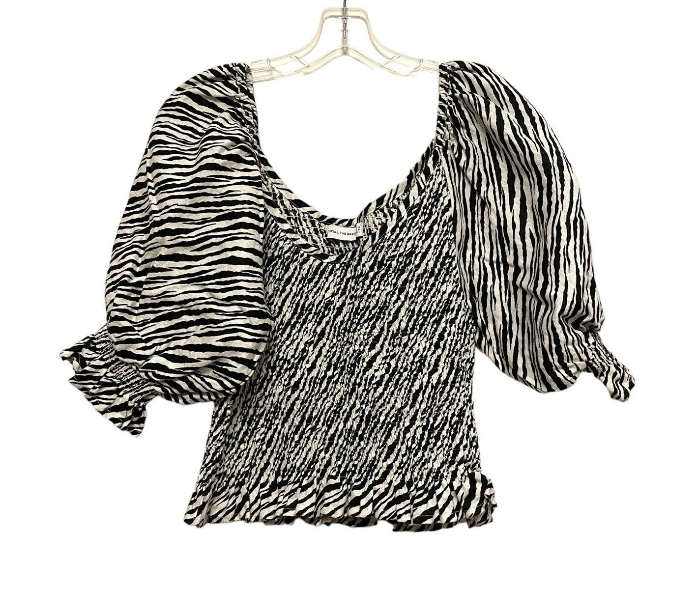 Gently pre-owned Faithfull The Brand Tani Smocked Linen Blouse in black and white. 100% linen material in zebra animal print. Puff short sleeves with elastic cuffs and ruffle. Smocked through body, with small ruffle hem. Scoop neck and back. Short length. In good used condition. Size US 8 Measurements (in inches): Pit to pit 14 Length 20 Shoulder to cuff 14 Measurements are approximate. Check out my other listings and bundle items to save on shipping! zebra, milkmaid, linen, smocked, ruffle, puff, boho, preppy, casual, going out, beach, vacation, resort, cruise, party, cocktail, breathable, summer