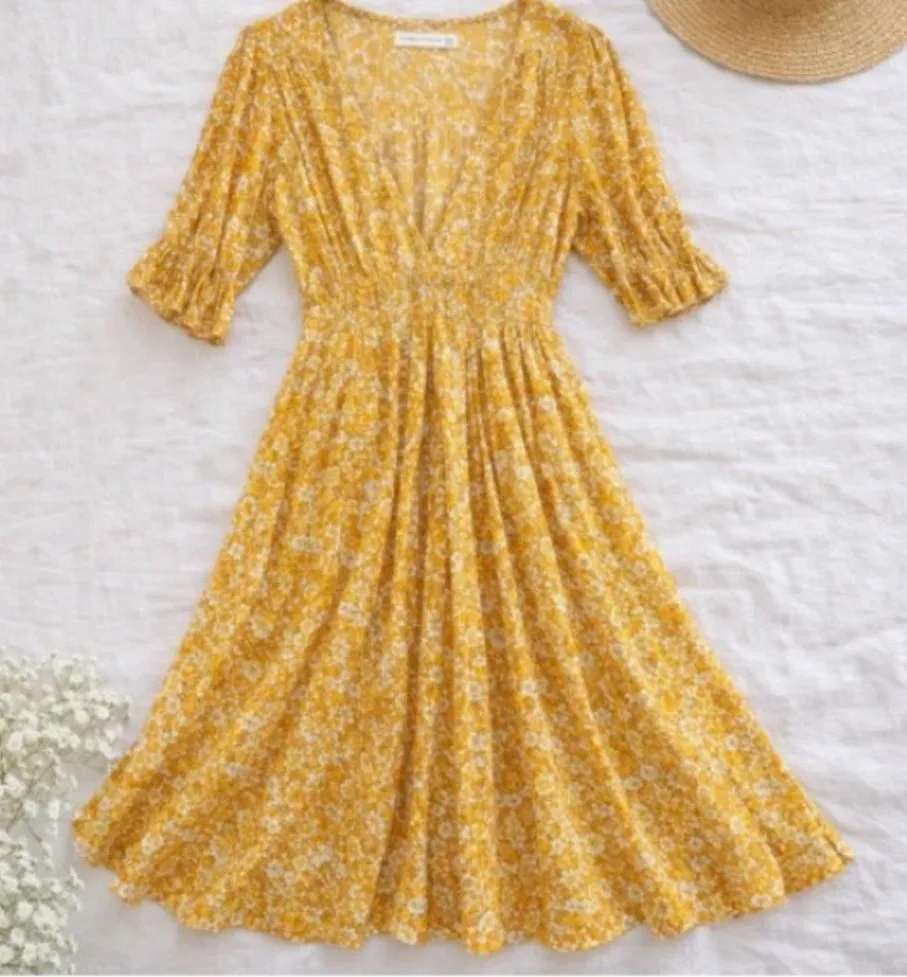 Faithfull the Brand yellow floral midi dress featuring a flattering deep V neckline, softly gathered waist, and flowy skirt. Lightweight woven fabric with a romantic, feminine silhouette perfect for warm weather, vacations, brunch, or casual weddings. Timeless boho style from a cult-favorite brand. Details: • Brand: Faithfull the Brand • Size: XS (AUS 6 / US 2) • Color: Yellow with white floral print • V-neckline • Short flutter sleeves • Midi length • Lightweight, breathable fabric Excellent pre-owned condition. Smoke-free home. romantic, European summer, Italy vacation, brunch dress, garden party, resort wear, feminine, flowy