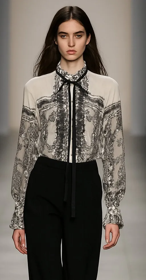 A statement blouse - Monochrome Nouveau chiffon top featuring button down center front and cuffs. The top is finished with ruffle detailing at front and a neck tieup. Black and white 100% Lyocell Relaxed, oversized fit. This blouse could fit sizes XS, S, M Measurements available upon request A couple snags in the back, but it’s not visible when worn as the busy print hides imperfections. Excellent condition otherwise