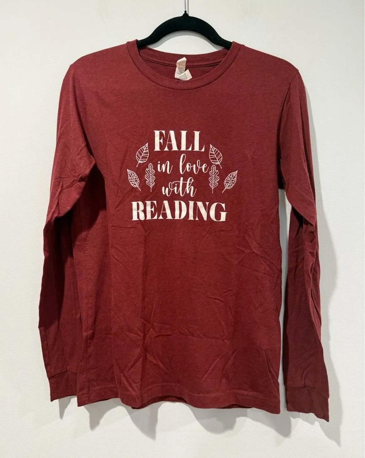 "Fall In Love Reading" Top Womens Small Heathered Burgundy Graphic Long Sleeve · Size Small · Mate... Show more