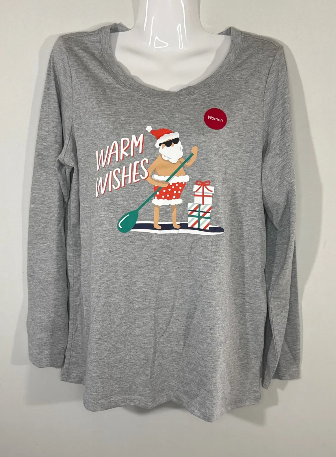 Women's medium gray long sleeve t-shirt with a festive holiday graphic. The playful design features Santa Claus paddleboarding with presents and the phrase "Warm Wishes." Perfect for casual holiday gatherings or lounging at home during the festive season. New with tags Measurements: • Chest: 20 in • Sleeve: 23 in • Length: 26 in Type: T-Shirt Department: Women Style: Basic Material: Cotton Blend, Polyester Neckline: Round Neck Sleeve Length: Long Sleeve Sleeve Type: Classic/Fitted Sleeve Pattern: Graphic Print Theme: Holiday, Funny Features: Stretch Character: Santa Claus Fit: Regular Fabric Type: Jersey Occasion: Casual Keywords: Family PJs, holiday t-shirt, Christmas graphic tee, Santa Claus shirt, paddleboard graphic, festive loungewear, winter casual, long sleeve top, women's holiday apparel, seasonal graphic tee, gift idea, cozy top