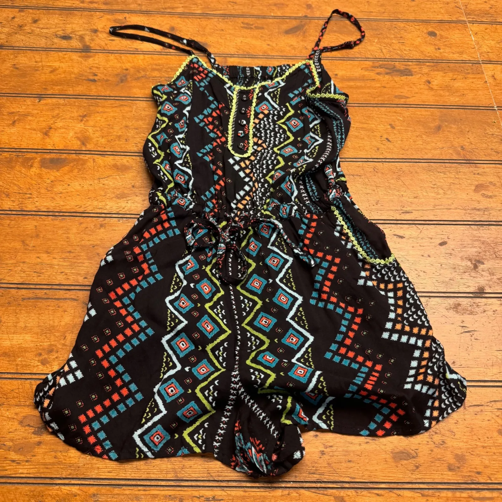 Capture sunny days and vibrant energy in this eye-catching Fan & Flirt romper. A kaleidoscope of geometric patterns in vivid turquoise, coral, and lime green dances across a deep black background, creating a striking boho-chic statement. The playful design features delicate adjustable spaghetti straps, a flattering cinched waist with a decorative tie, and a charming button-front detail, all finished with a playful zigzag trim along the neckline and pockets. This piece is perfect for a music festival, a beach vacation, or a casual day out. Department: Women Type: One-Piece Style: Romper Fabric Type: Rayon Theme: Native American Material: 100% Rayon Sleeve Length: Sleeveless Pattern: Geometric Occasion: Casual Set Includes: Shorts Keywords: geometric print, boho, festival, summer, strappy, shorts romper, casual, vacation, tribal, chevron, playful, lightweight, tiered hem