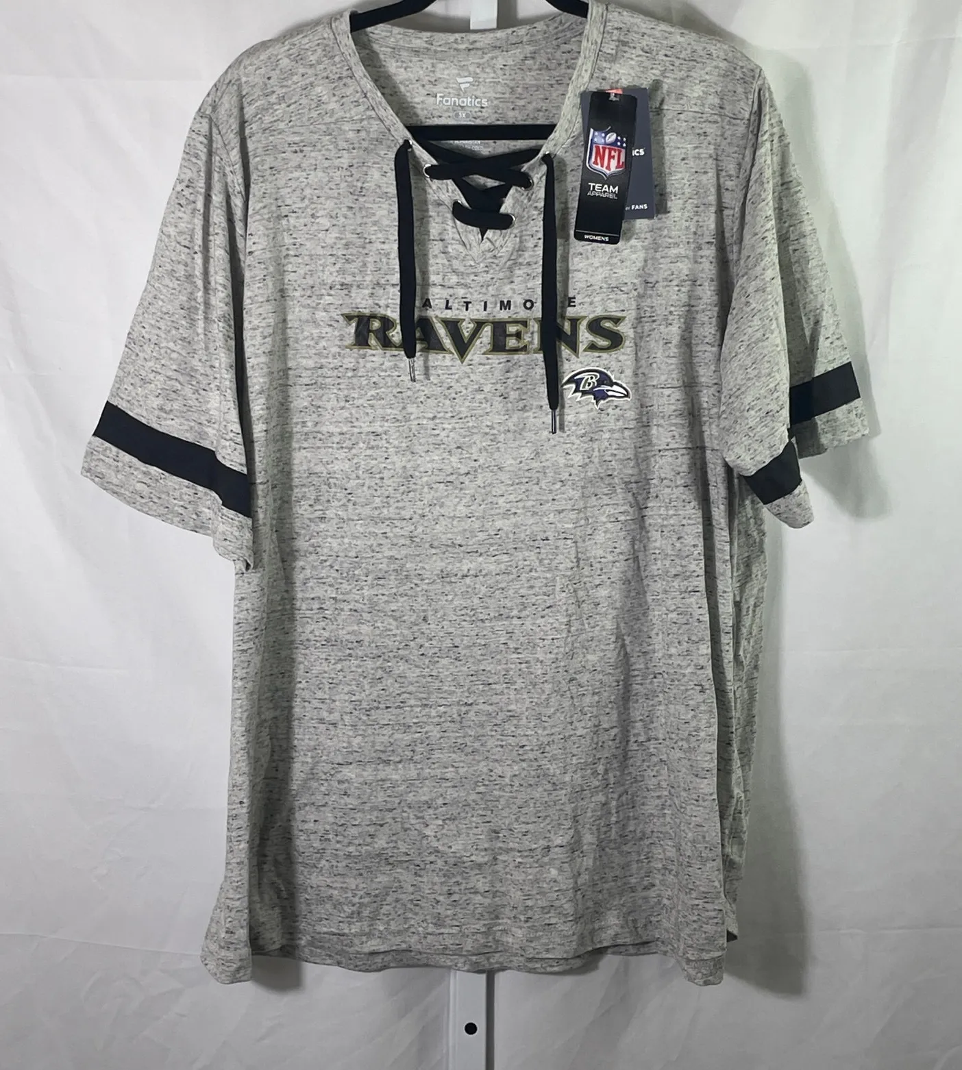 NWT Baltimore Ravens Lace-up T-shirt - Womens Size 3X - Heather Gray - Baltimore Ravens emblem on the front - PTP: 28", Length: 30" - 60% Cotton, 40% Polyester - Baltimore Ravens, Baltimore Ravens gear, Baltimore Ravens sportswear, Baltimore Ravens sports gear