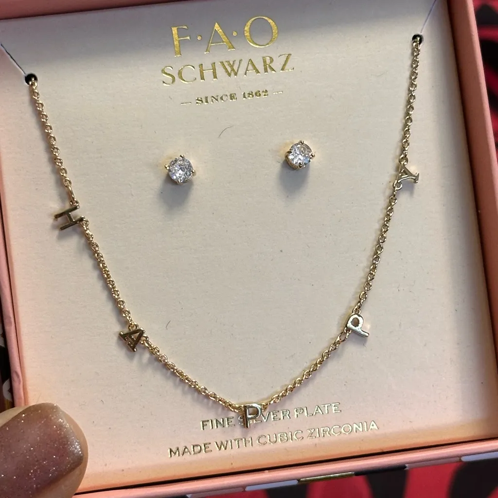 A charming FAO Schwarz necklace and earring set designed for women. This set features a gold-tone chain necklace with the word HAPPY spelled out in individual letter charms, accented by cubic zirconia stud earrings. This set is perfect for everyday wear or as a delightful gift. Set Includes: Earrings, Necklace Main Stone Color: White/Colorless Metal: Silver Plated Main Stone: Crystal Material: Crystal Main Stone Shape: Round Type: Jewelry Set Secondary Stone: Cubic Zirconia Occasion: Birthday, Anniversary, Christmas Number of Gemstones: 2 Theme: Love, Luck Unit Type: Unit Keywords: FAO Schwarz, necklace, earrings, jewelry set, happy face, letter charms, cubic zirconia, silver plate, gold tone, dainty, giftable, everyday wear