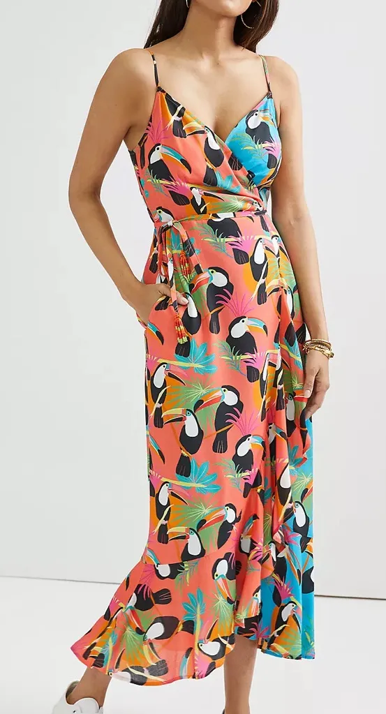 Farm Rio Anthropologie Toucans Wrap Maxi Dress Size XS. Great condition, like a new. Super soft, 100% Viscose. Adorned with a flock of colorful toucans, this maxi dress grants your warm-weather wardrobe a playfully tropical twist. * Exclusively for Anthropologie * Viscose * Adjustable straps * Wrapped maxi silhouette * Tie closure * Hand wash * Pockets About Farm Rio What began as a handful of goods at a local fashion fair booth has grown into one of Brazil's most recognizable labels for sun-soaked dressing. With vibrant colors, bold silhouettes, and feminine details embedded in every design, Farm Rio's cheerful creations are crafted with an exotic, toes-in-the-sand spirit that's simultaneously fashion-forward and vintage-inspired.