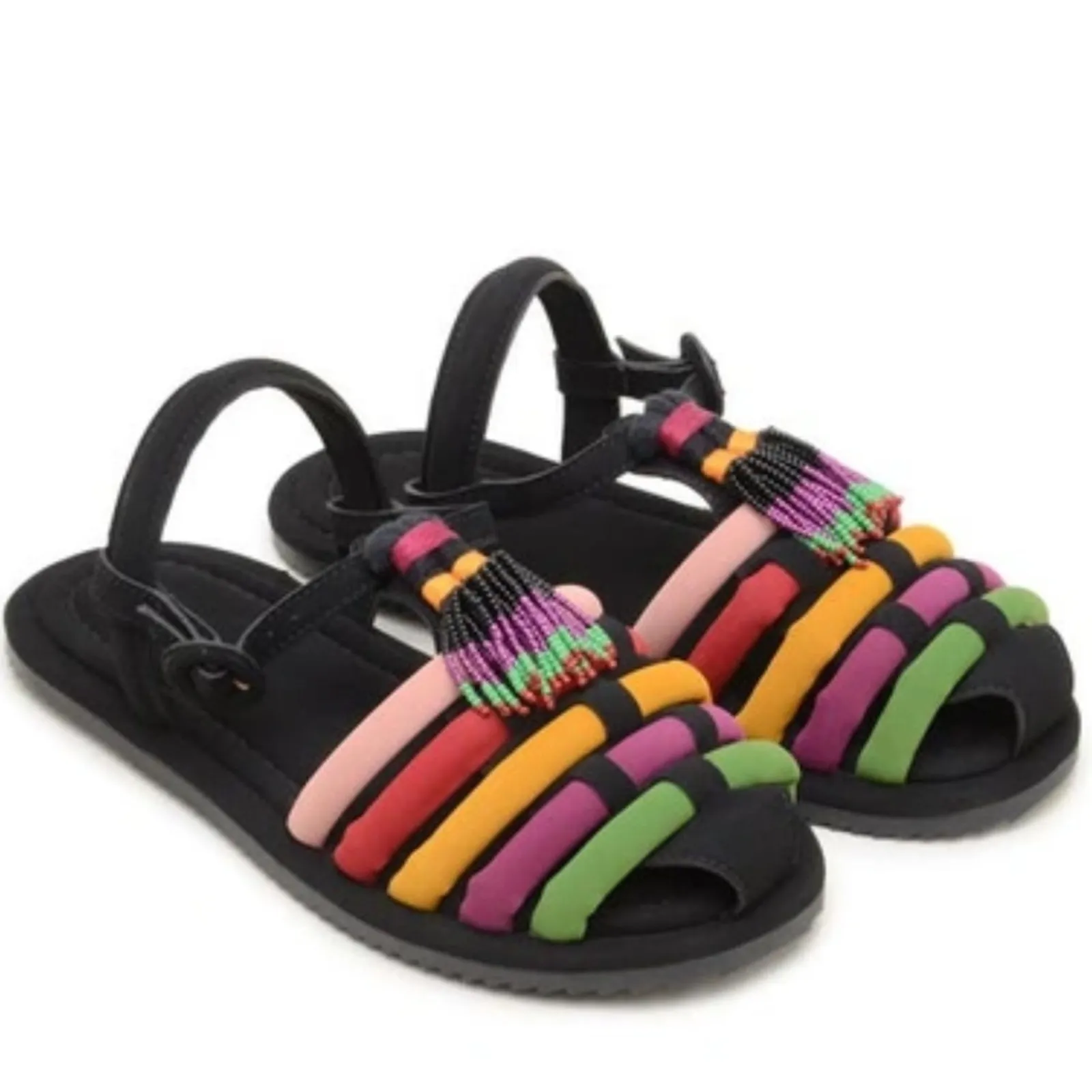 Condition: Like new without box. Some minor marks on the outer bottom sole from retail environment, and a scuff on the side of the upper (see pointed arrow in photo). Details: Rubber and synthetic upper Strappy buckle sandal Colorful, vibrant colorway Padded insole Adjustable ankle strap * Smoke & pet free. Fast shipping! * 5 star seller.