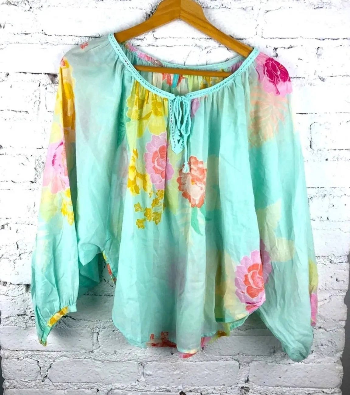 FARM Rio light blue blouse showcasing a vibrant floral print. This top features a flattering tie-neck detail and a relaxed silhouette, perfect for a bohemian aesthetic. Measurements: • Bust: 25 in • Length: 24.5 in • Sleeve Length: 20 in Type: Blouse Department: Women Style: Tunic Material: Cotton Blend Neckline: Off the Shoulder Sleeve Length: Long Sleeve Sleeve Type: Balloon Sleeve Pattern: Floral Theme: Bohemian, Beach, Nature, Colorful Features: Lightweight, Sheer, Breathable Fit: Relaxed Fabric Type: Chiffon Keywords: farm rio, boho, tropical, resort wear, vacation, beach, lightweight, flowy, pullover, long sleeve, womens top, summery, feminine, bright Great Condition. No Stains, Tears, Rips, Holes or Pilling. From a smoke free home and perfume free home. We carefully inspect each item for quality. Thank you for stopping by! We ship out the next day.