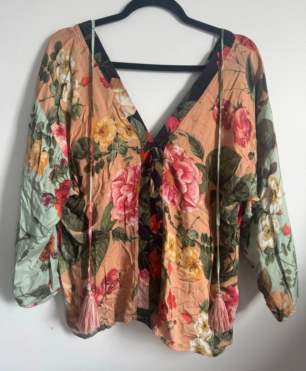 Description Gorgeous FARM Rio floral blouse featuring a romantic vintage-inspired floral print in warm peach, blush, sage, and green tones. Designed with a flattering deep V-neckline, flowy relaxed fit, and decorative tassel ties at the front. Lightweight and breathable 100% viscose fabric with a soft drape, perfect for warm weather or layering. This piece embodies bohemian, cottagecore, romantic, and coastal style—easy to dress up or down. ✨ Designed in Brazil. ⸻ 📐 Measurements (laid flat, approx.) • Pit to pit: ~19–20 inches • Length (shoulder to hem): ~23–24 inches • Sleeve: 3/4 length • Size on tag: Small (S) 📌 Please compare measurements to a similar top for best fit. ⸻ 🧵 Details • Brand: FARM Rio • Size: Small • Material: 100% Viscose • Color: Peach / Blush / Green Floral • Style: Boho, Romantic, Cottagecore • Neckline: V-neck • Closure: Tassel tie front • Condition: Pre-owned, good condition • No holes or stains noted- fraying along the seam in the back (see photo • Light wrinkling consistent with viscose fabric