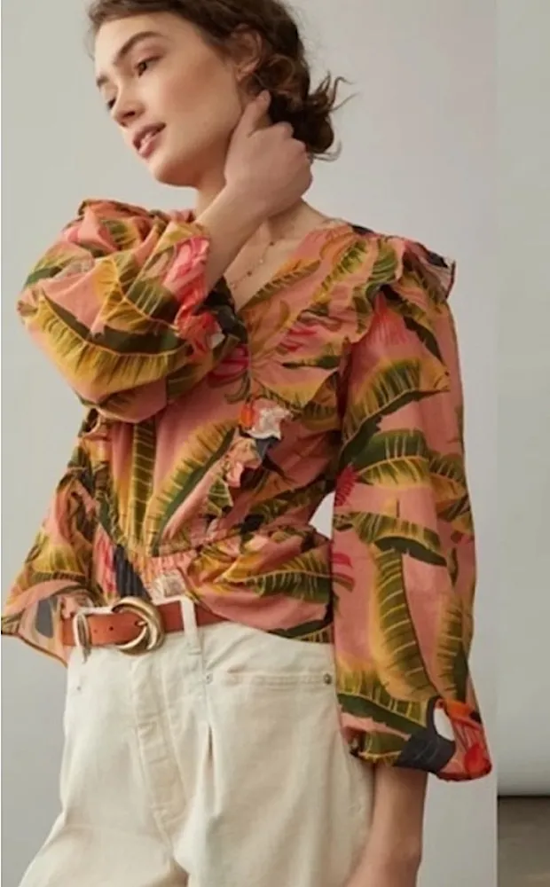 Farm Rio for Anthropologie Yasmine Ruffled Blouse Toucan Floral Tropical Small. This blouse brings "... Show more