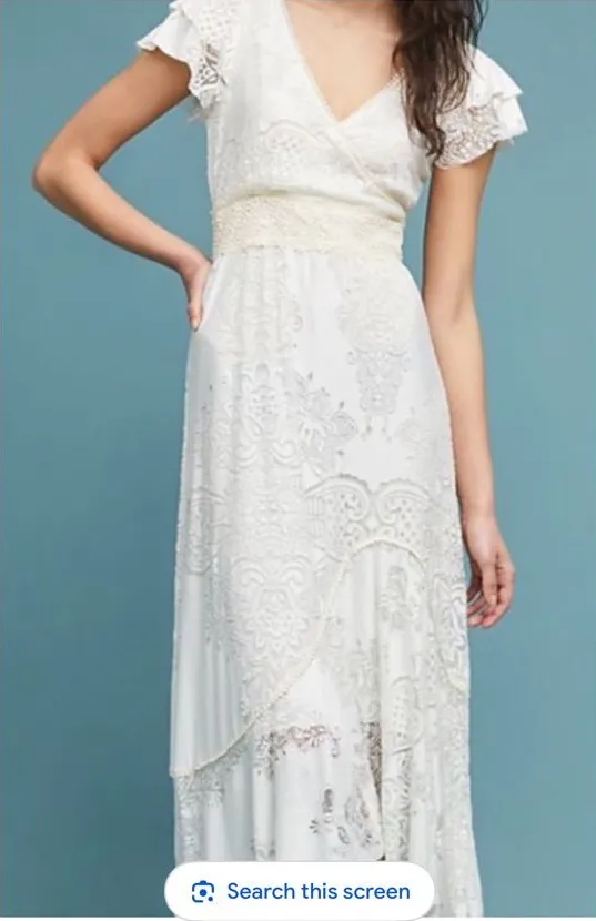 Elegant white maxi dress with intricate lace details. Short sleeves and flowing skirt. Ideal for special occasions. In excellent preowned condition Approx measurements 15 inch pit to pit 13.5 inch waist across 45 inch total length