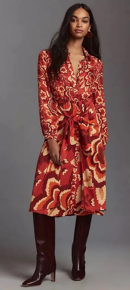 Farm Rio Long-Sleeve V-Neck Floral Midi Shirt Dress women's size medium Red - $90 - From Jeremy
