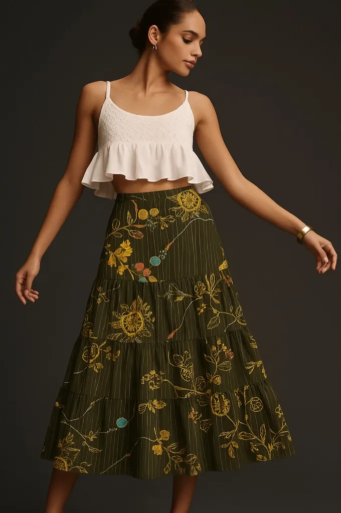 This beautiful boho-inspired skirt features a rich olive base with intricate yellow, coral, and turq... Show more