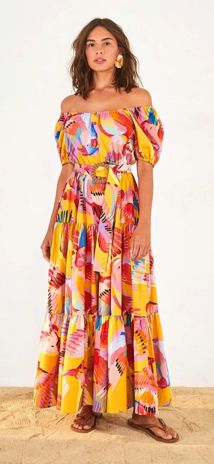 size XS. I do think it runs like an XS/S, but please check measurements. There is plenty of room around the bust area, and it has an elastic waist. $230 retail, and new with tags. No flaws. Feel as free and mighty as a macaw in this puff-sleeve tiered cotton dress splashed with a vibrant, painterly print of feathered friends. Beaded buttons add an artisan finish to the festive design. Button half-placket Scoop neck (can be worn off the shoulders) Short sleeves with elastic cuffs Elastic waist Removable belt Unlined 100% cotton Tags: farm rio dress, tropical dress, spring, summer, vacation, maxi dress, vibrant dress, off shoulder dress, belted dress.
