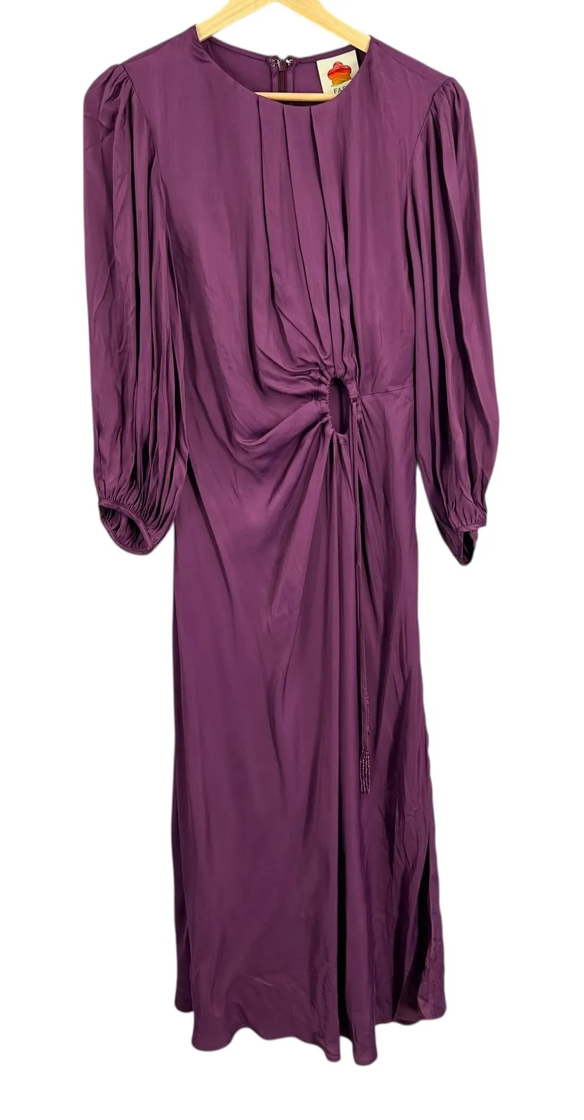 Farm Rio Purple Dress Balloon Sleeve Piping Cutout Mid Calf Length Size Small New This midi dress by FARM Rio is a size Small and brand‑new with tags. Crafted in a lustrous silk‑like viscose fabric, it features a rich purple hue, balloon sleeves, a back zip closure, and a flattering midi‑length drape (~48″). There are pleats at the neck giving a gentle drape and a cutout with beaded ties. The flat measurements: armpit to armpit ≈ 17″; waist ≈ 15″; length ≈ 48″; sleeve length ≈ 19″. Ideal for special occasions, weddings, or elevated evening wear. Condition: New with tags Keywords: Farm Rio, maxi dress, purple dress, ruched, cutout, puff sleeve, long sleeve, bohemian, feminine, resortwear, vacation, statement dress, elegant