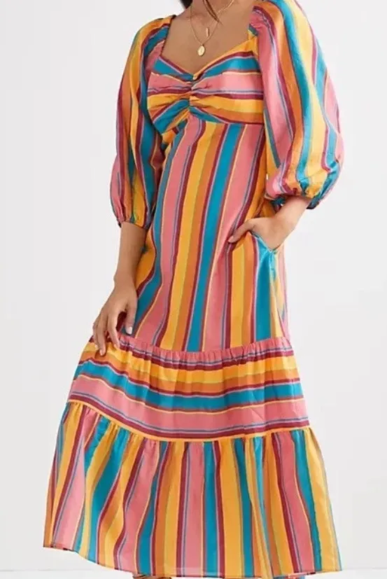Farm Rio for Anthropologie Rainbow stripes dress in size Extra Small. Gently used condition. Bright and cheerful midi dress with bold stripes. Features puff sleeves and a flattering fit. Perfect for adding color to your wardrobe.