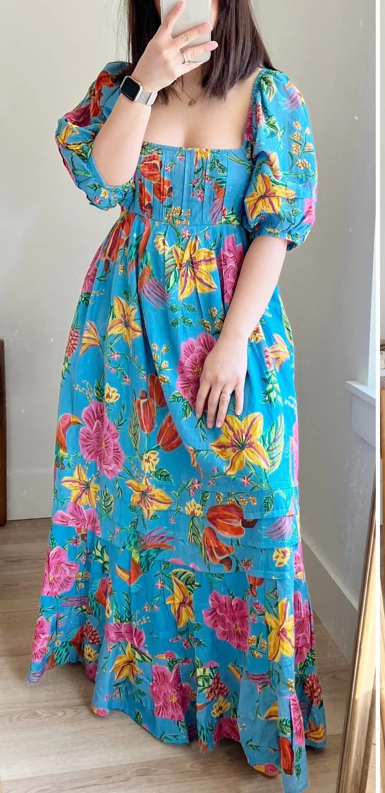 Enter an island paradise in this flower-powered midi fashioned with voluminous puff sleeves and an open back with beaded tassels. 43" length Bust slightly adjustable due to tie Square neck Elbow-length sleeves Partially lined 100% cotton Machine wash, line dry Imported Like new with no tag and small flaw to lining. Small hole only to lining- not visible while wearing. See photos. Tags: floral, tropical, botanical, jungle, flowers, puff sleeves, maximalist, maxi, midi, below the knee, open back, tie back, full skirt, bright, colorful, statement piece, picnic, date night, vacation, beach, coastal, cruise, formal, lightweight, wedding guest, reception, party, comfortable, comfy, flowy