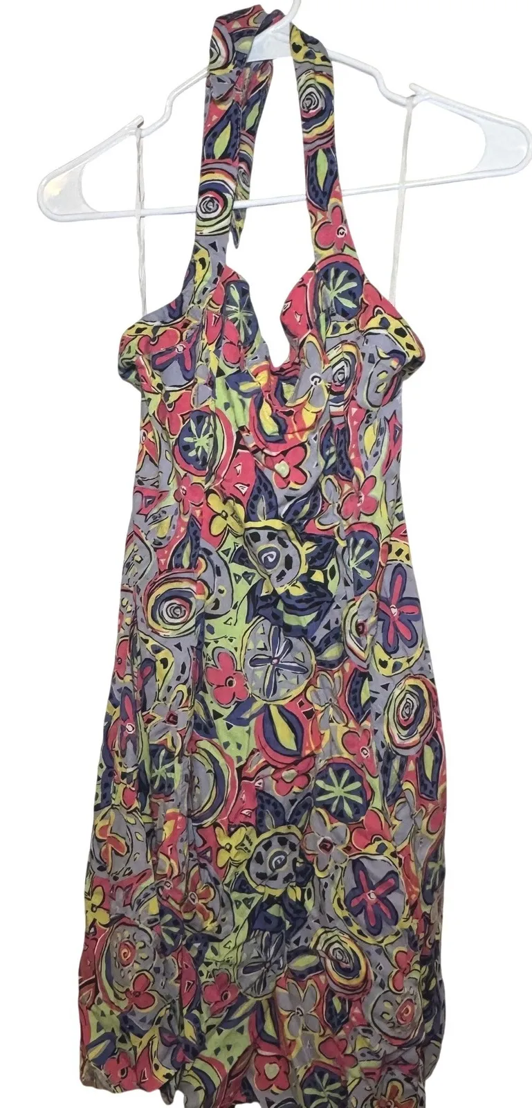 Style: Sundress, Tank Dress Dress Length: Midi Department: Women Sleeve Length: Sleeveless Pattern: Floral Occasion: Casual, Party/Cocktail Material: Rayon Fabric Type: Rayon Theme: Tropical Neckline: Halter Season: Summer Sleeve Type: Strappy Sleeve Closure: Tie Accents: Ruffle Features: Backless, Straps Keywords: halter dress, midi dress, floral dress, rayon dress, bohemian, summer dress, vacation, lightweight, tropical, resortwear, casual, unique print, womenswear Vintage
