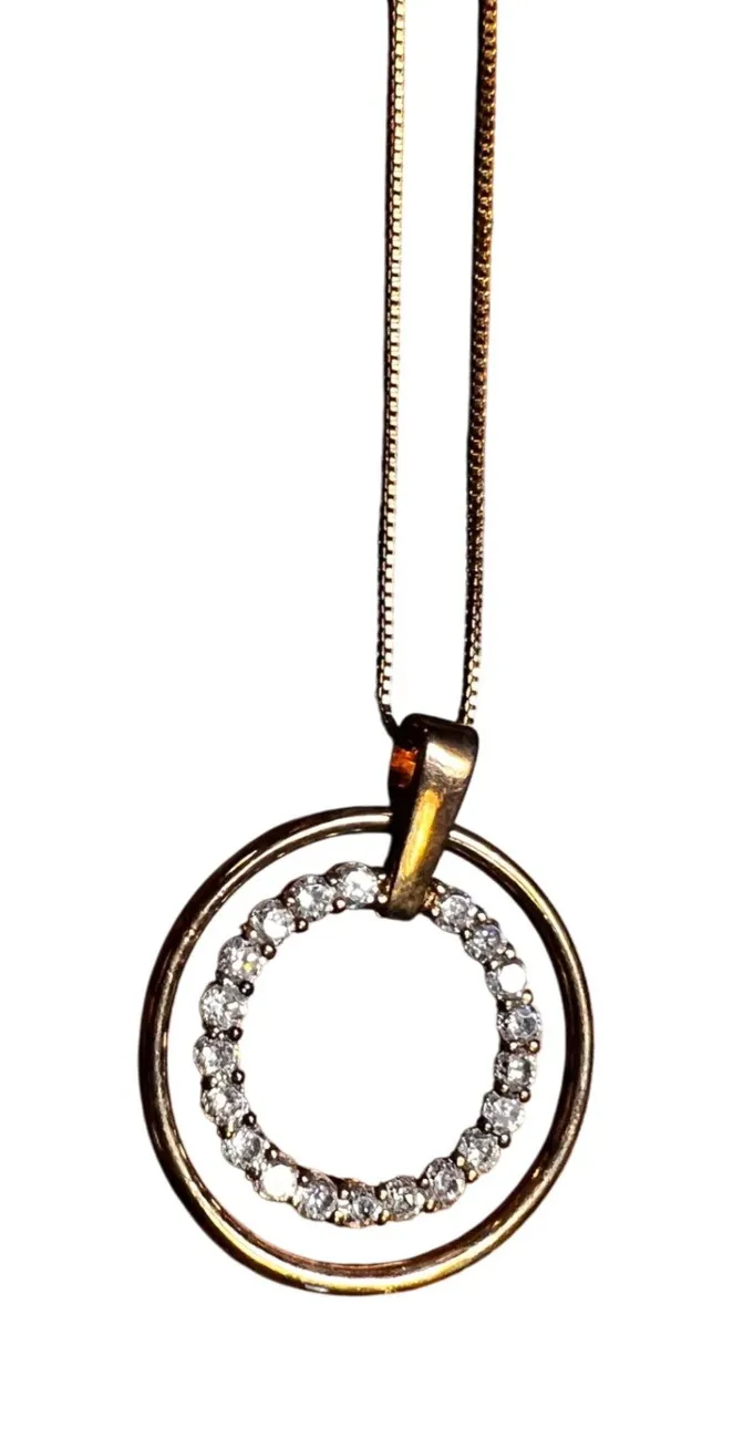 A radiant statement piece awaits! This necklace features a captivating double circle pendant, with an inner circle sparkling with cubic zirconia stones. The pendant hangs gracefully from a delicate chain, crafted from 925 sterling silver. The gold tone adds a touch of warmth and luxury to the design. This necklace is perfect for adding a touch of sparkle to your everyday look, elevating a cocktail dress for a night out, or gifting to someone special. Style: Pendant, Chain, Statement, Charm Type: Necklace Color: Gold Main Stone Color: White/Colorless Pendant Shape: Round Metal: Gold Plated Sterling Silver Keywords: FAS necklace, double circle pendant, cubic zirconia necklace, 925 sterling silver necklace, gold tone necklace, statement necklace, circle pendant necklace, dainty necklace, elegant necklace, jewelry, gift for her, fashion necklace, women's necklace