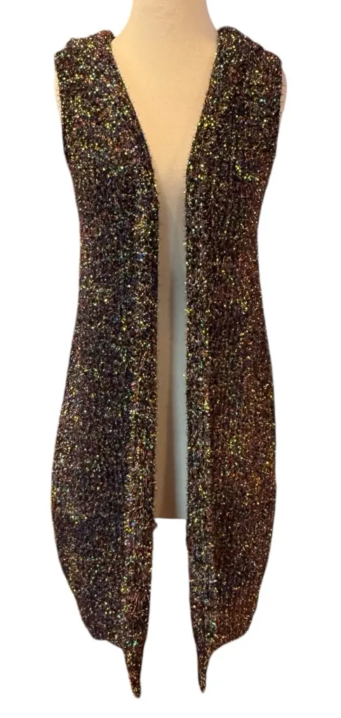• Multi-color rainbow metallic tinsel/eyelash knit that catches the light beautifully • Longline, open front, with a cozy attached hood • Sleeveless • Scalloped hem • Size Small / Medium • 100% Polyester • Excellent pre-owned condition. No visible damage or flaws Measurements: Pit-to-Pit: 17.5” Shoulder-to-Hem: 36” Fast Shipping; orders shipped next business day Keywords: Rainbow, metallic, tinsel, eyelash knit, fuzzy, sparkly, glitter, holographic, multicolor, longline vest, hooded vest, sleeveless cardigan, festival wear, rave outfit, maximalist, dopamine dressing, carnival, holiday party, New Years Eve, NYE, whimsical, boho, bohemian, artsy, eclectic, disco, 90s style, y2k aesthetic, layering piece, confetti knit