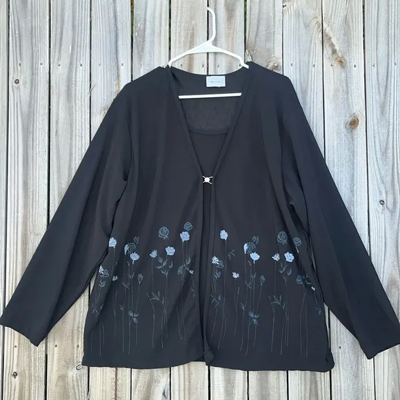 Long sleeved cardigan style top - built in blouse top clip front enclosure long sleeved black floral top size 2XL stretchy top smoothe texture One part of the tag is missing, it looks like it may have been cut Refer to pictures for approximate measurements Typically ships same or next day except weekends and holidays! Church reserved minimal vintage fashion bug