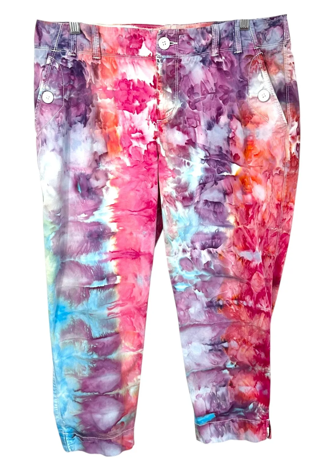 Eye-catching tie-dye capris, delivering a vibrant and unique aesthetic. These Fashion Bug capris feature a colorful tie-dye pattern with a blend of pinks, purples, and blues, creating a visually stunning design. The pants are cropped, offering a modern and stylish look, and have a button accent for added detail. With functional pockets and a comfortable fit, they combine fashion and practicality. Original, handmade tie dye. Upcycled: Made from a gently pre-owned garment. Waist: 18" across Style: Capri Department: Women Material: Cotton Leg Style: Straight Features: Pockets Type: Pants Fabric Type: Twill Closure: Button Pattern: Solid Accents: Button Theme: Bohemian, Retro, Festival, Tie Dye Occasion: Casual Keywords: Tie Dye Pants, Capris, Cropped Pants, Fashion Bug, Womens Pants, Multicolor Pants, Button Accent, Size 14, Bohemian, Casual Pants, Summer Pants, Spring Pants, Unique Pants, Statement Pants Smoke-free, pet-free. Ships within 1 to 2 business days. Save the planet. Shop second-hand.